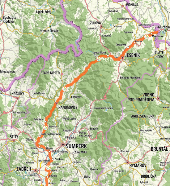 Von Branná aus geht es weiter auf schmalen Straßen der III. Klasse über die malerischen Gemeinden Vikantice und Habartice, wir genießen die Ausblicke auf das Massiv des Bergs Králický Sněžník. Wir kommen in das Städtchen Hanušovice, wo wir das Brauereimuseum besuchen können. Von Hanušovice folgen wir auf unserer Fahrt dem Fluss Morava, die Radroute führt weiter unter der Nummer 51. Über Bohdíkov, Ruda nad Moravou und Bohutín gelangen wir nach Bludov, das durch seine thermalen Bäder bekannt ist. Von hier können wir nach Šumperk (a) oder Zábřeh (b) weiterfahren, wo wir in einer der empfohlenen Pensionen Unterkunft finden.
