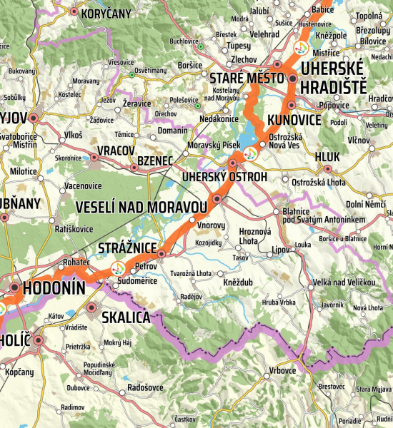 Die Gesamtlänge des Abschnittes ist 44 km. Von der letzten Stadt der vierten Etappe Uherské Hradiště begeben wir uns nach Kunovice, wo wir das Luftfahrtmuseum besuchen können. Wer die Durchfahrt durch die Stadt meiden will und wen es nicht stört, Kunovice auszulassen, kann die Richtung Kostelany nehmen und wieder in Ostrožská Nová Ves auf die Radroute treffen, wo man durch das Gelände des hiesigen Schwefelbads fährt. Von Uherský Ostroh ist vor allem ein Renaissanceschloss mit einem Arkadenhof zu erwähnen. Das Schloss bietet einen Besichtigungsweg mit dem Aufstieg auf den Turm, ferner kann man die Galerie besuchen oder in das Kellergeschoss hinuntersteigen in die Ausstellung Kristallhöhle.